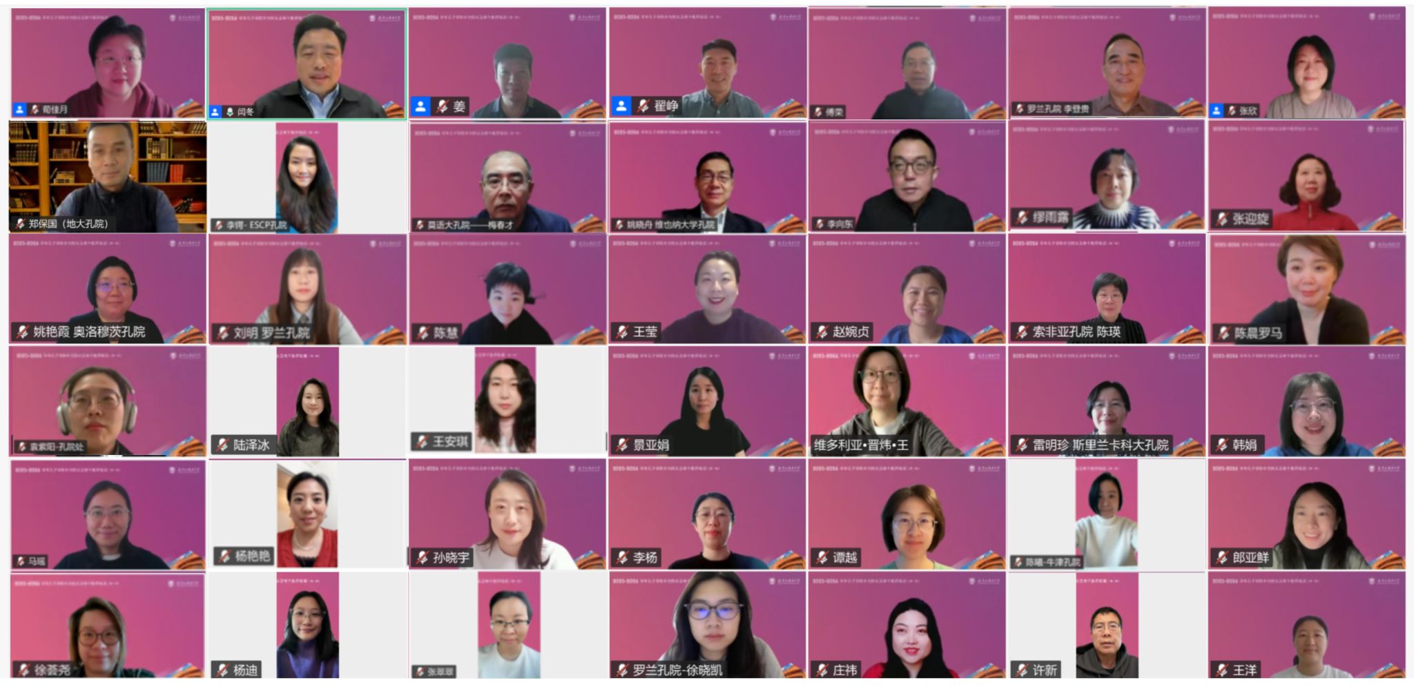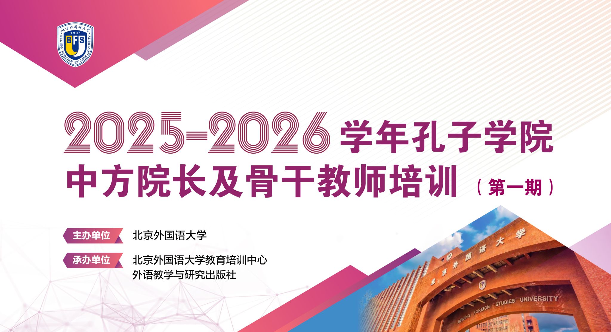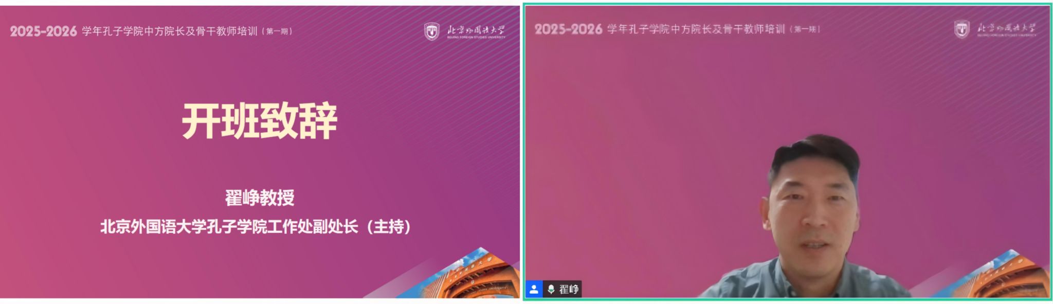 12月6日,2025-2026学年北京外国语大学孔子学院中方院长及骨干教师培训(第一期)在线上顺利开班。本期培训由我校组织部和孔子学院工作处主办,外语教学与研究出版社承办,共有50位北外孔子学院中方院长和骨干教师参加。本次培训旨在进一步推进我校孔子学院管理团队和教师队伍的专业化、职业化发展,全面提升孔子学院在全球语言文化传播中的对话协作能力,为推动构建开放包容、平等互惠的语言文化传播平台培养坚实人才基础。