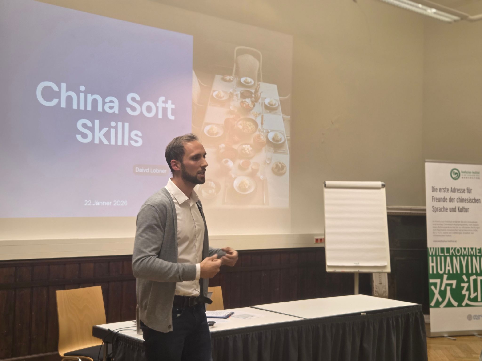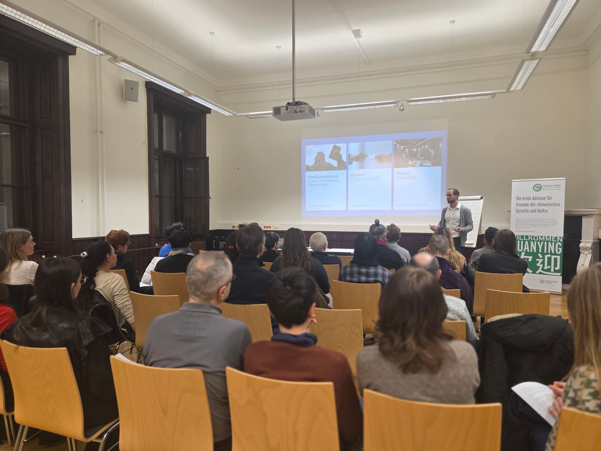 1月22日,维也纳大学孔子学院在维也纳大学玛丽埃塔·布劳厅(Marietta Blau Saal) 举办了主题为 “中国软技能” 的讲座,主讲人为维也纳大学汉学系讲师大卫·洛布纳(David Lobner)。约30人聆听了讲座。