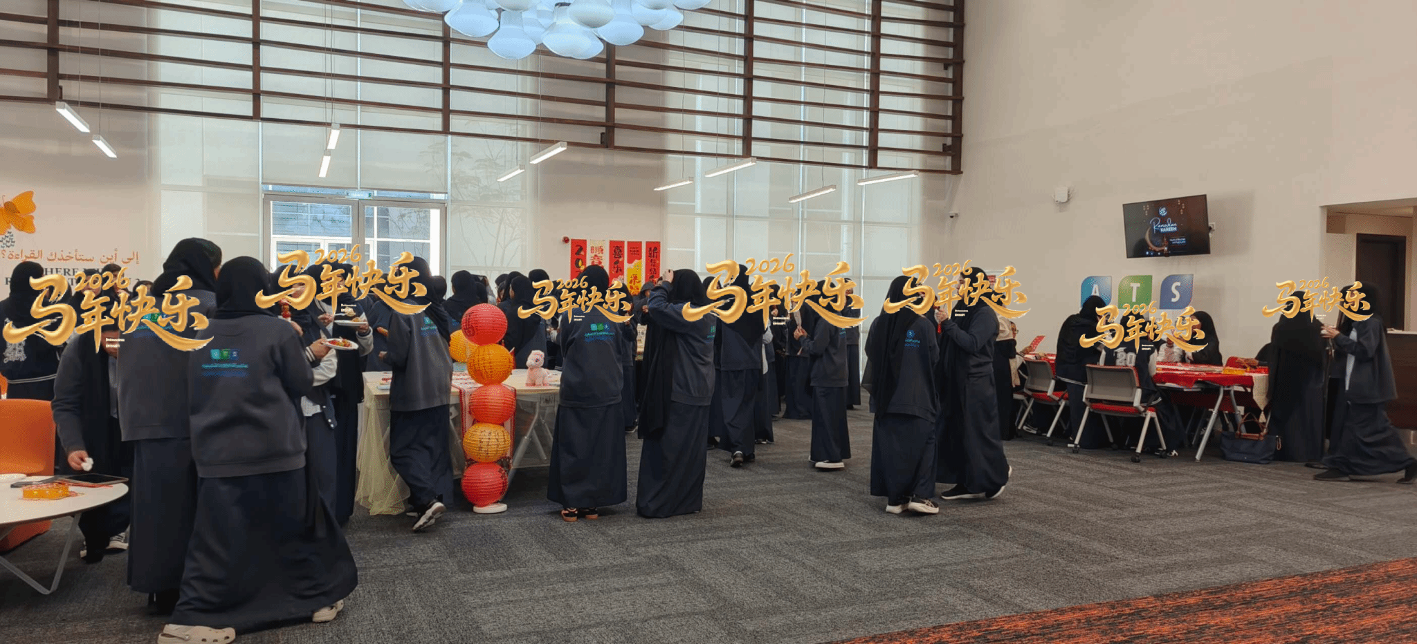 当地时间2月16日,扎耶德大学孔子学院与应用技术高中巴尼亚斯校区(Applied Technology Schools Baniyas campus)联合举办“中国新年主题文化体验活动——马到功成”春节庆祝活动。作为春节系列活动的首场活动,女生校区专场在该校女生区图书馆举行,现场以中国红为主色调进行布置,节日氛围浓厚。应用技术高中巴尼亚斯校区校长凯特·普朗布博士(Dr. Kate Plumb)、副校长莱亚莉·哈迈迪(Layali Hamaidi)及副校长马萨达·阿尔布雷基(Masada Albreiki)全程出席活动。
