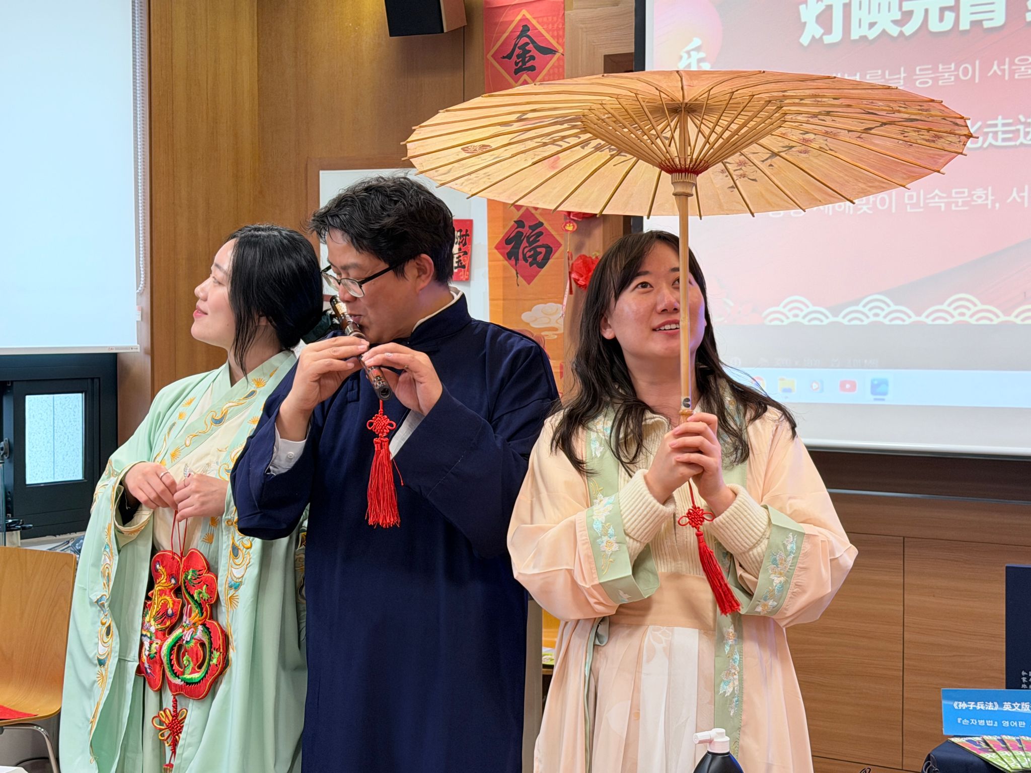 民乐展演环节以乐为媒,促进了跨文化共鸣。孔院教师身着汉服弹奏古筝,韩国音乐爱好者即兴吹奏中国竹笛,清越的笛声与悠扬的琴音相互和鸣,展现了中国传统乐器的艺术魅力。