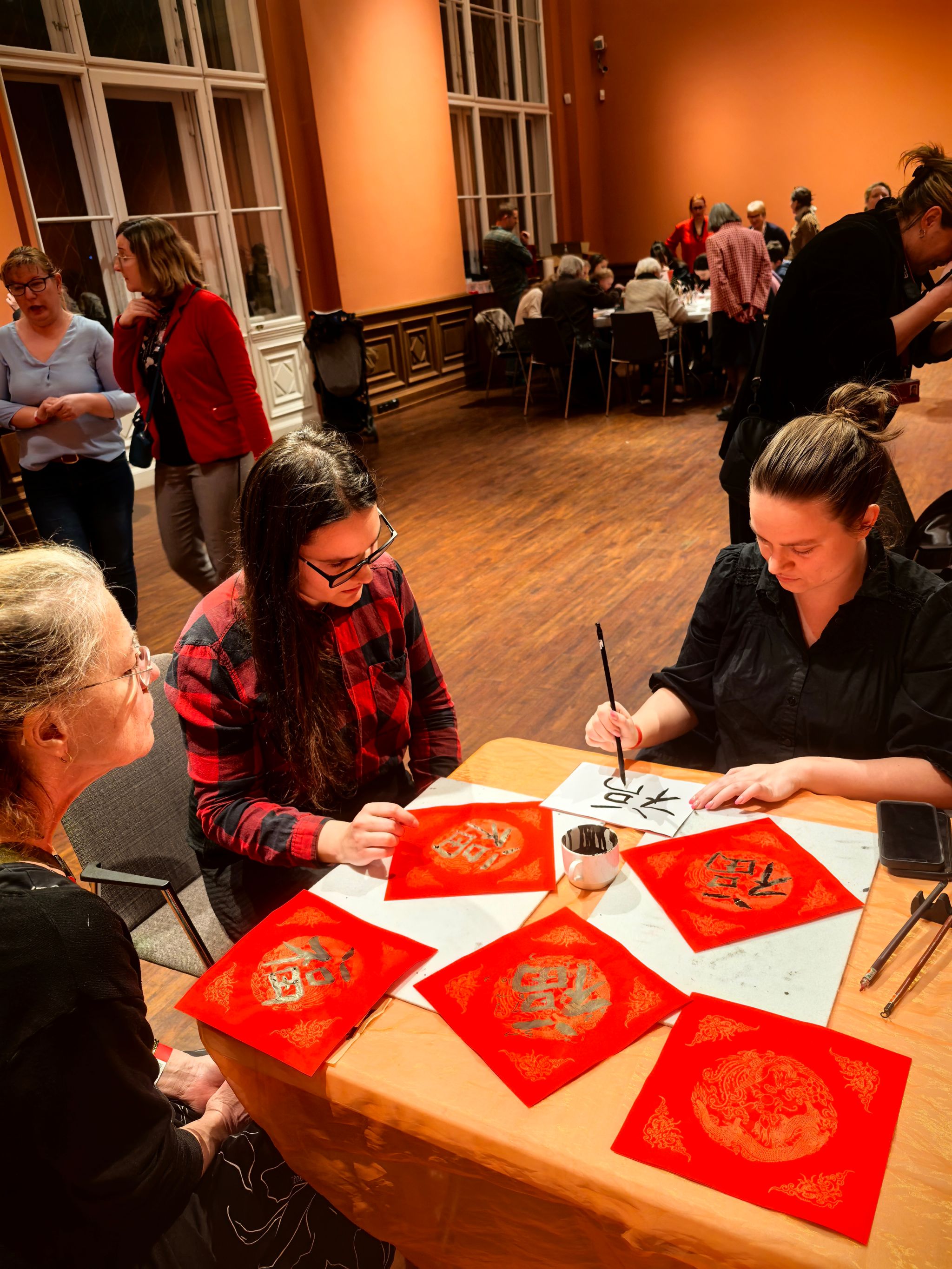 在书法体验区,活动分为“福”字书写与中文姓名定制两个板块。孔子学院教师不仅现场讲解“福”字的文化内涵与使用场景,指导观众描摹书写,还根据观众需求为其书写专属中文名字并赠予祝福签。许多观众在教师指导下尝试亲手书写,沉浸式体验毛笔书写的乐趣,感受汉字的艺术韵律。