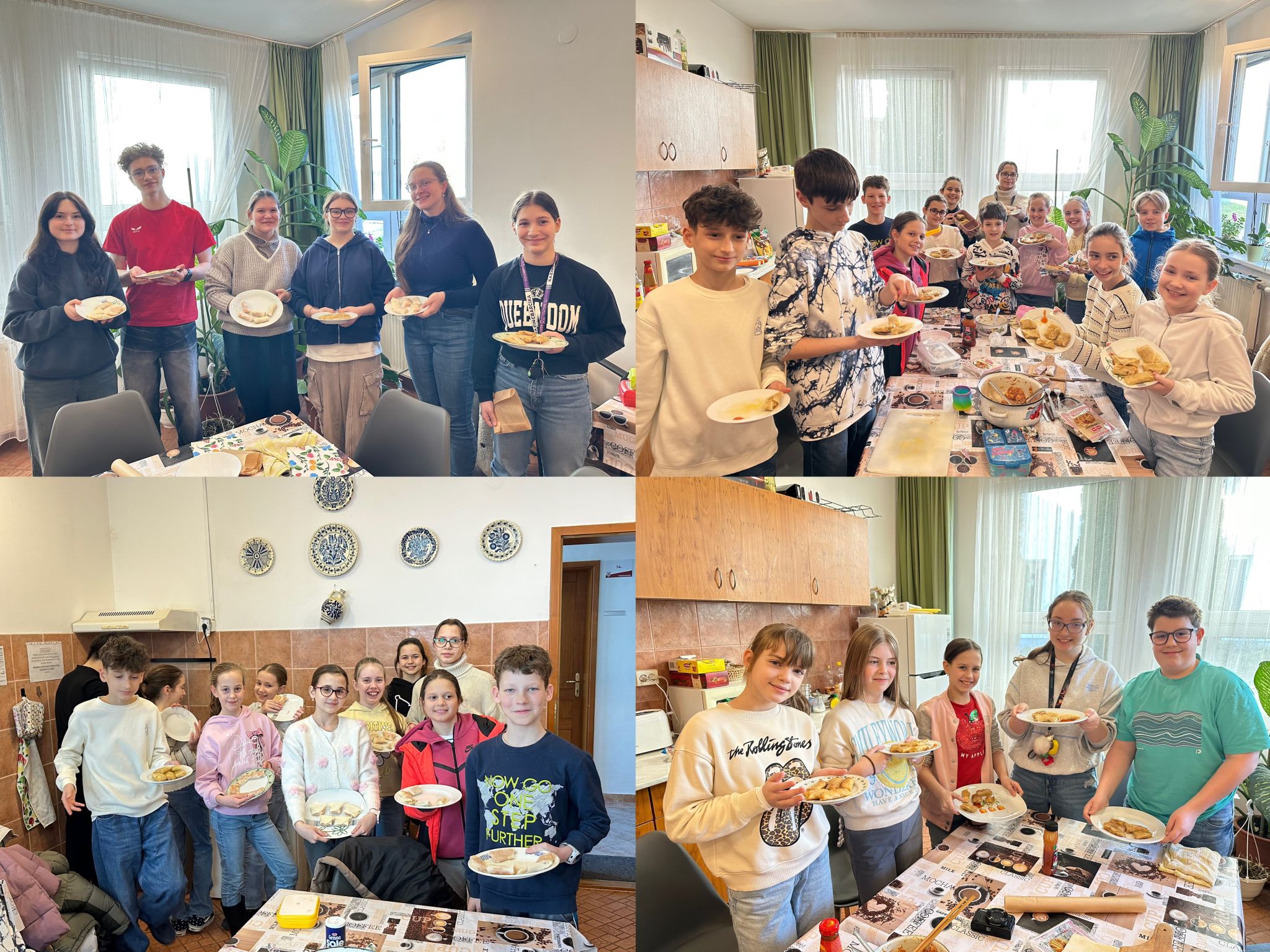 随后,教师演示了春卷的制作步骤,并手把手指导学生掌握制作技巧。在老师们的指导下,学生们迅速投入实践,一张张普通的春卷皮在他们的巧手下变成了形态各异的春卷。现场欢声笑语不断,学生们互相请教、展示作品、分享心得,气氛融洽。当金黄酥脆的春卷出锅时,香气弥漫整个活动现场。学生们捧着自己亲手制作的美食,脸上洋溢着喜悦与自豪,迫不及待地品尝起来。清脆的口感与鲜美的味道赢得了大家的一致称赞。