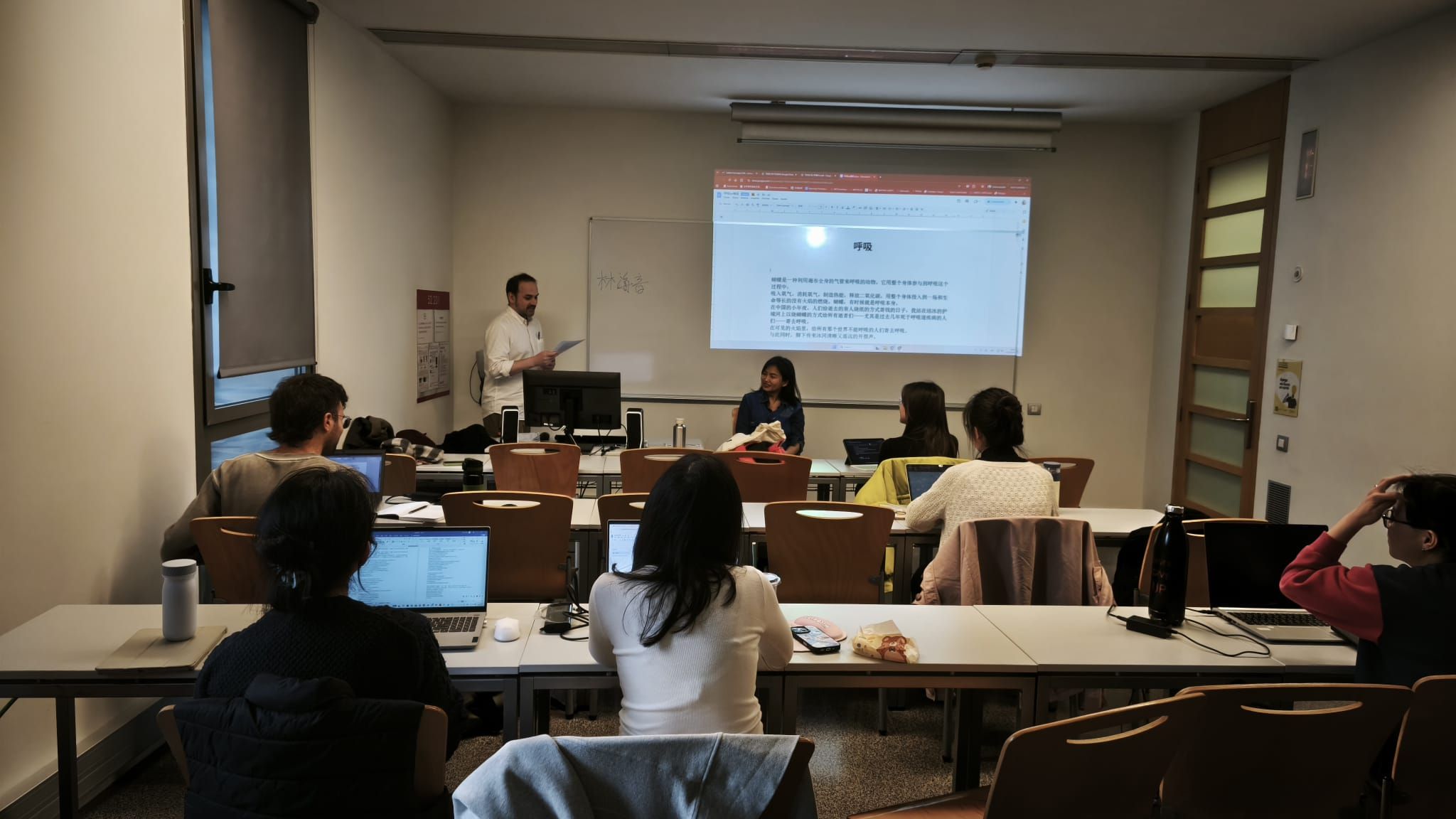 2月24日,糖匪受邀为庞培法布拉大学“全球语言翻译(中西方向)”硕士生举办讲座。活动以其诗歌《呼吸》的西语译本为研讨核心,引导学生从意象、语言节奏与思想内涵等角度探讨诗歌翻译的“再创造”过程,并结合影像作品《呼吸VI》拓展解读维度。活动由该校翻译与语言科学系硕士项目协调员马诺·帕冯-贝利松主持,马诺老师长期从事中国文学翻译与思想史研究,曾在北京大学担任访问学者,并参与“China Traducida(翻译中国)”项目的编辑工作,在推动中国文学西语传播方面颇具影响力。