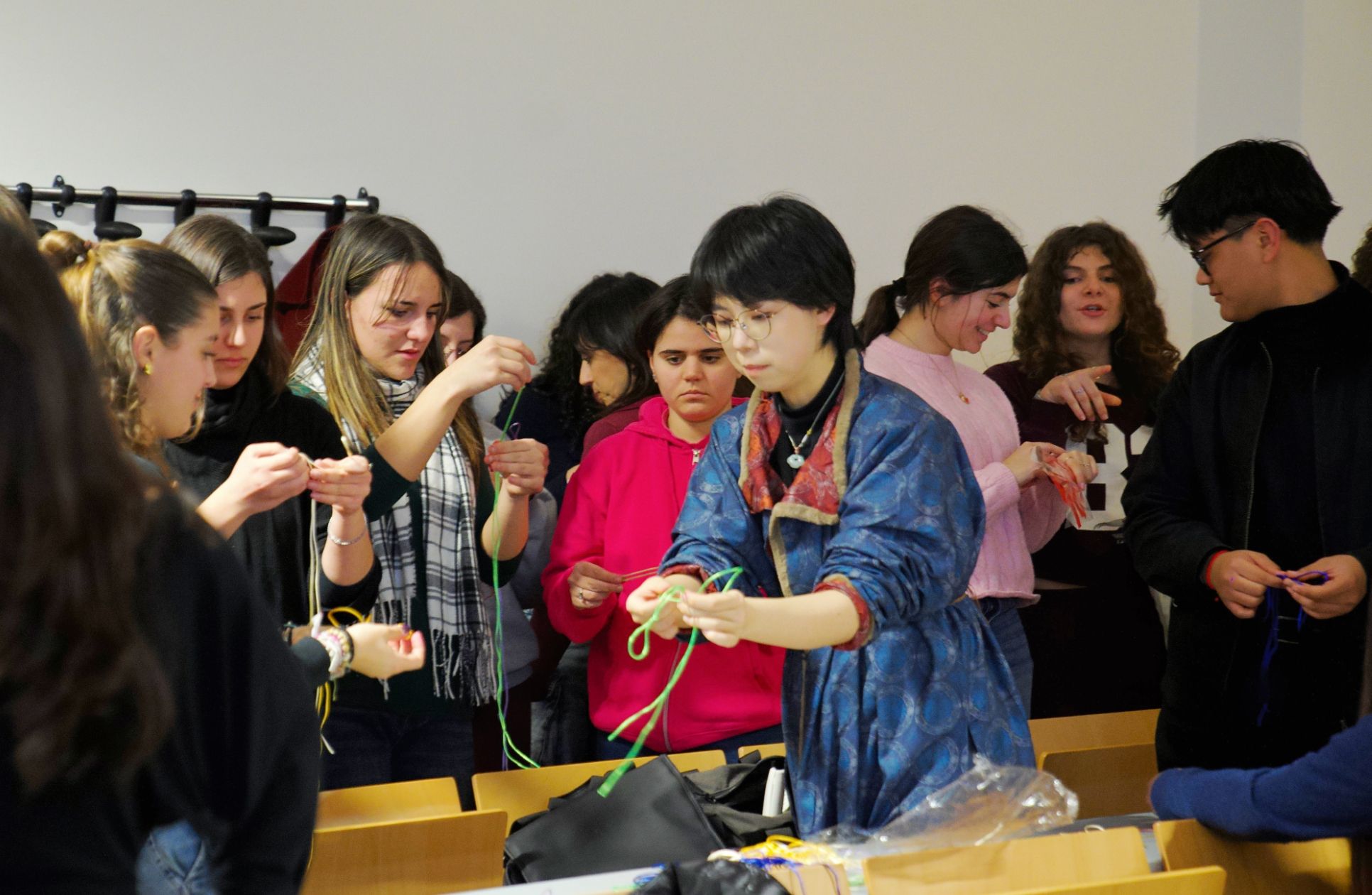 在文化体验环节,学生们分组参与了四项精心设计的活动。在“巧手中国结”区域,学生们在孔院教师的指导下,亲手编织出对称精美的吉祥结,感受“以结寓意,以物寄情”的文化内涵。在“我的中文名”区域,孔院教师根据学生的意大利语名字,为其音译或意译出中文名并书写在书签上,解释汉字含义,引发了学生们对汉字结构与命名文化的浓厚兴趣。在“纸艺”区域,学生们在孔院教师的带领下,体验了剪纸的“一剪成形”与折纸的立体造型之妙。在“绕口令达人”区域,孔院教师通过精选绕口令,引导学生在欢声笑语中练习汉语发音,体会语言的韵律之美。