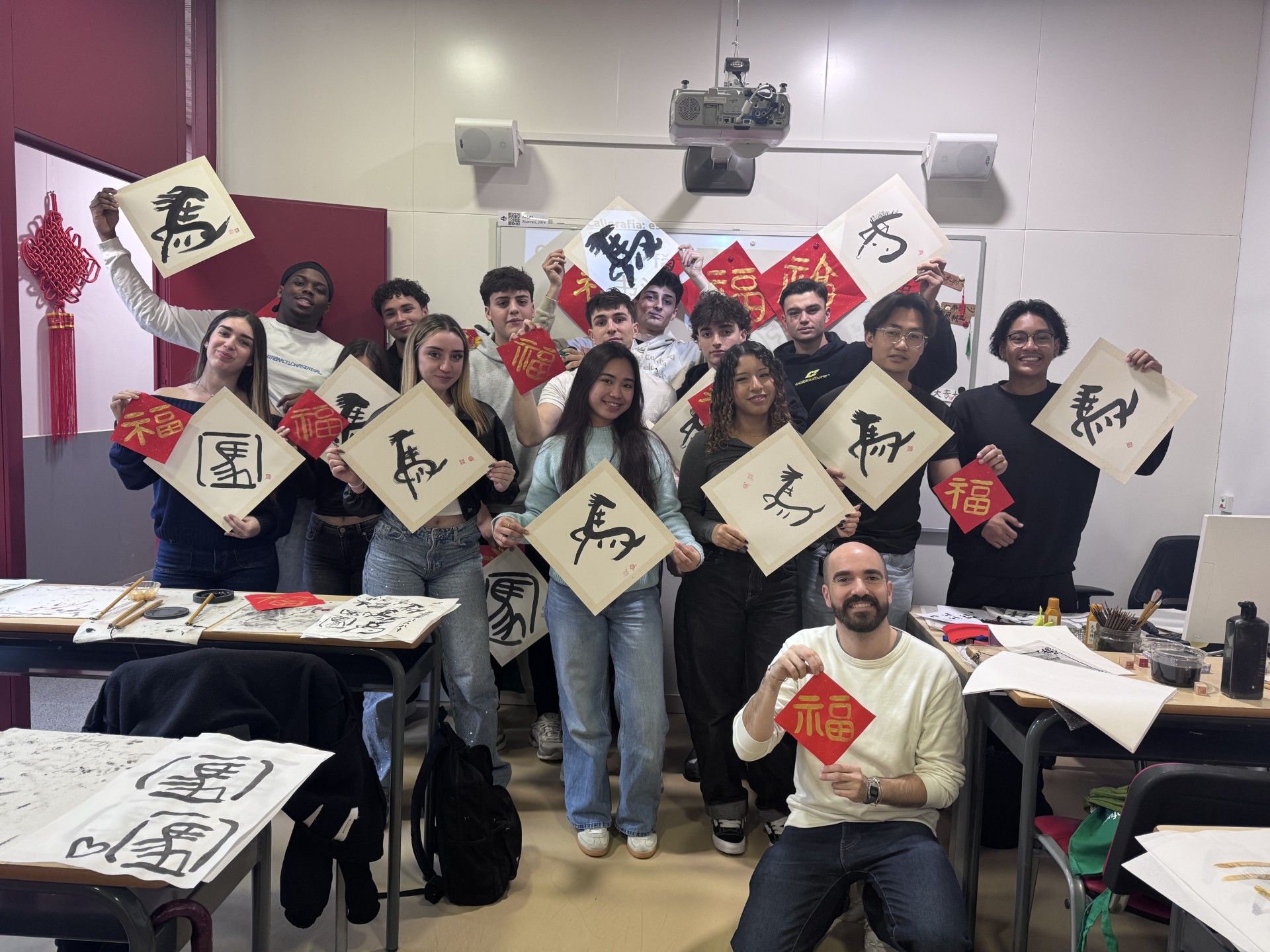 当地时间2月4日,巴塞罗那孔子学院邀请思图康(STUCOM)学院37名师生走进孔院,成功举办了一场“迎马年”中国书法专场体验活动。