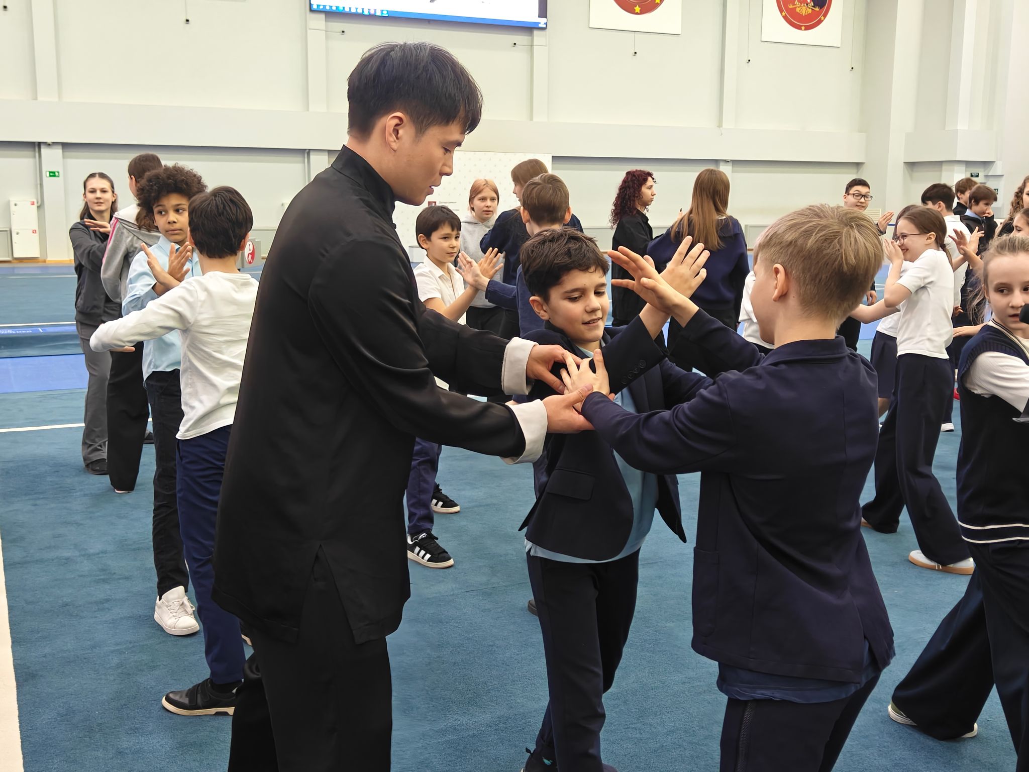 俄罗斯国家武术队现场表演了长拳、南拳、刀术、剑术等节目,尽显武术的力与美。莫语大孔院教师、国家一级运动员王朕以“走近中国武术:历史、太极拳与太极推手”为题,系统介绍了武术发展脉络、太极拳流派特色及核心技法,并结合动作示范阐释太极哲学。在互动体验环节,王朕带领参与者学习太极拳基础招式,让大家感受太极拳刚柔并济的独特韵味。