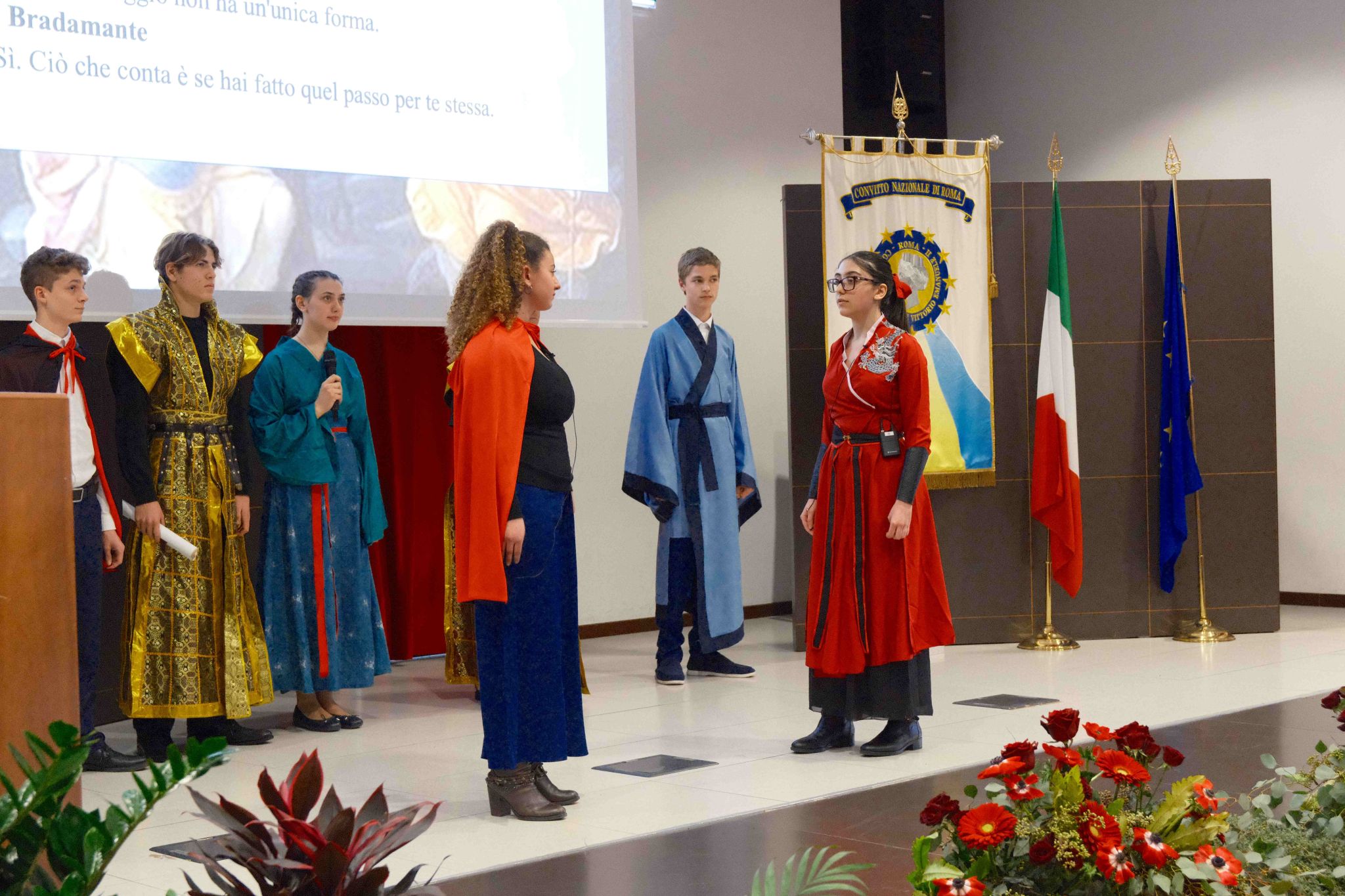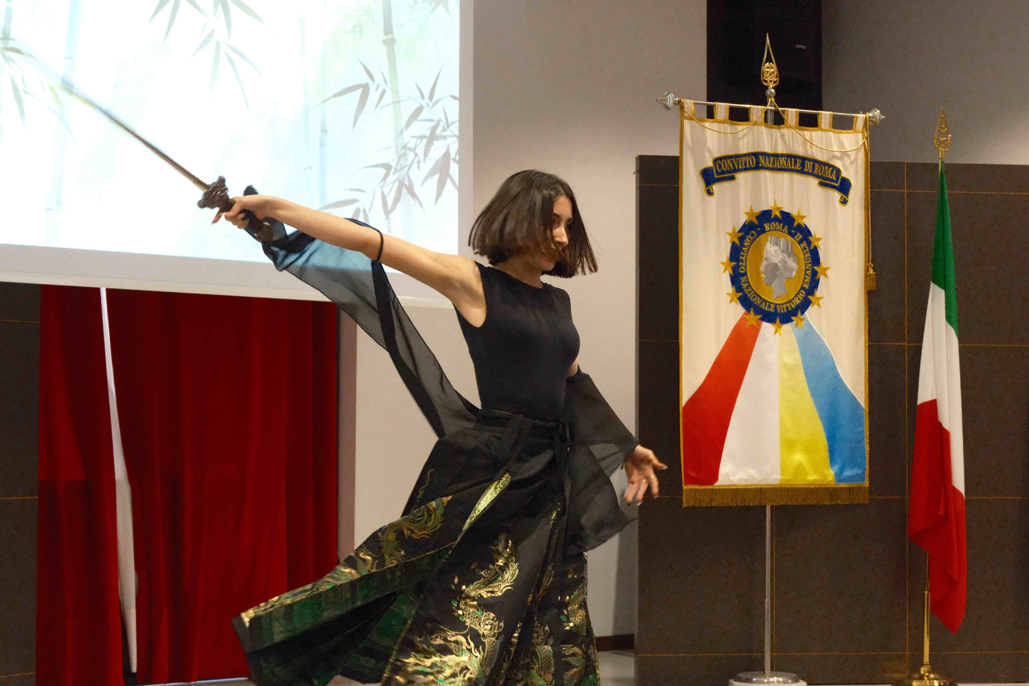 随后的文艺汇演精彩纷呈,学生们通过多种艺术形式展现中文学习成果和对中华文化的理解。1A班学生带来短剧《我们眼中的意大利和中国》,学习中文仅半年的他们用语言、动作和画笔描绘心中的两国形象。2A班和3B班学生合唱《甜蜜蜜》,传递经典旋律中的温暖情感。3B班和4B班学生呈现电影《哪吒2》配音选段,细腻展现角色内心世界。4A班学生表演《剑舞》,融合了传统舞蹈的柔美与剑舞的力量。2A班和3A班学生共同演绎短剧《花木兰与布拉达曼特》,让东西方两位女英雄跨时空相遇,讲述勇气与信念的故事。3B班两名学生带来相声《学说中文》,分享汉语学习中的趣事。最后,3B班学生以歌曲《我的梦》表达青春热情与梦想追求,为演出画上圆满句号。
