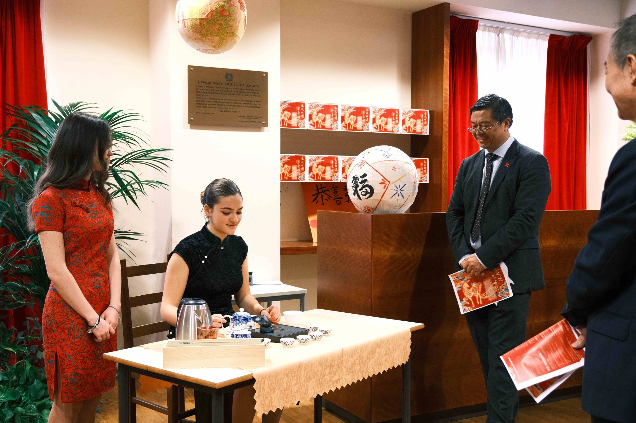师生代表以舞龙和扇子舞热情迎接来宾。为迎接中国春节,学生们提前一个月组建“春节艺术工作坊”,亲手制作了马年主题海报、精美花灯及水墨画等作品,在教学楼内布置了茶艺展台,营造出浓厚的节日氛围。