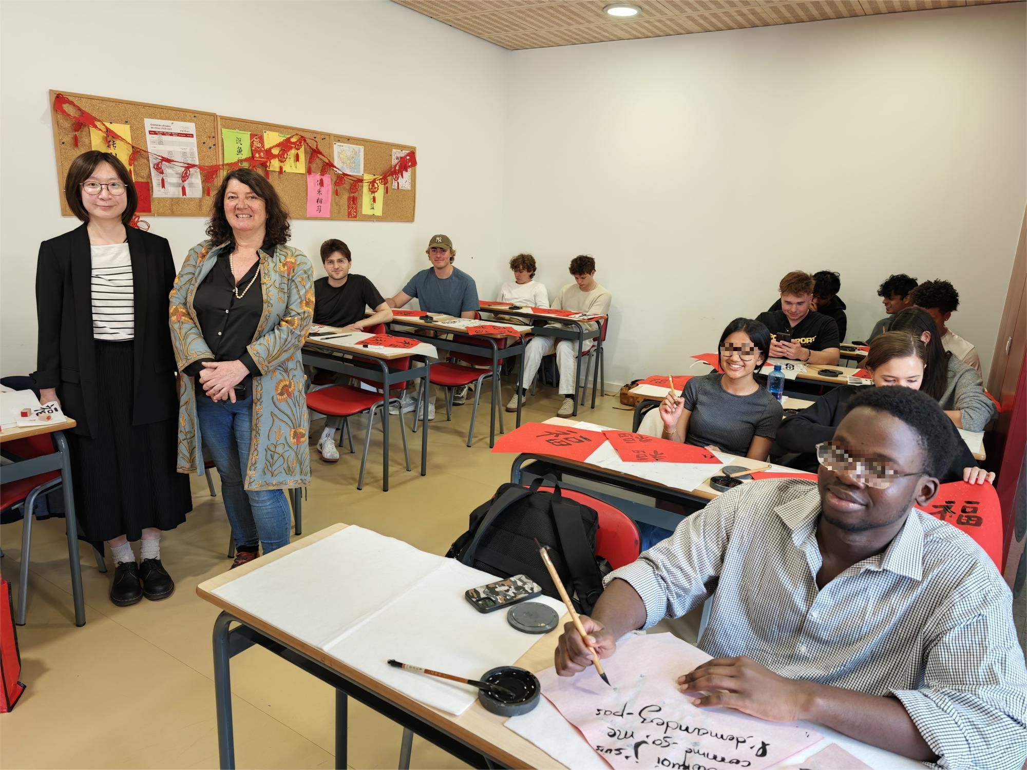 课堂上,巴塞罗那孔子学院中方院长王晋炜向学生们介绍了孔子学院的发展历程、教学特色及其在推动中西文化交流中的作用。西方院长高艾岚(Gaëlle Patin)对学生的到来表示欢迎,并鼓励他们积极参与文化交流,拓展国际视野。在互动体验环节,学生们尝试了毛笔书写汉字等文化活动,现场气氛轻松而热烈。带队教师石磊表示,这种亲身参与的方式,让学生们对中国文化有了更深的理解,也对文化差异与融合有了更直观的认识。
