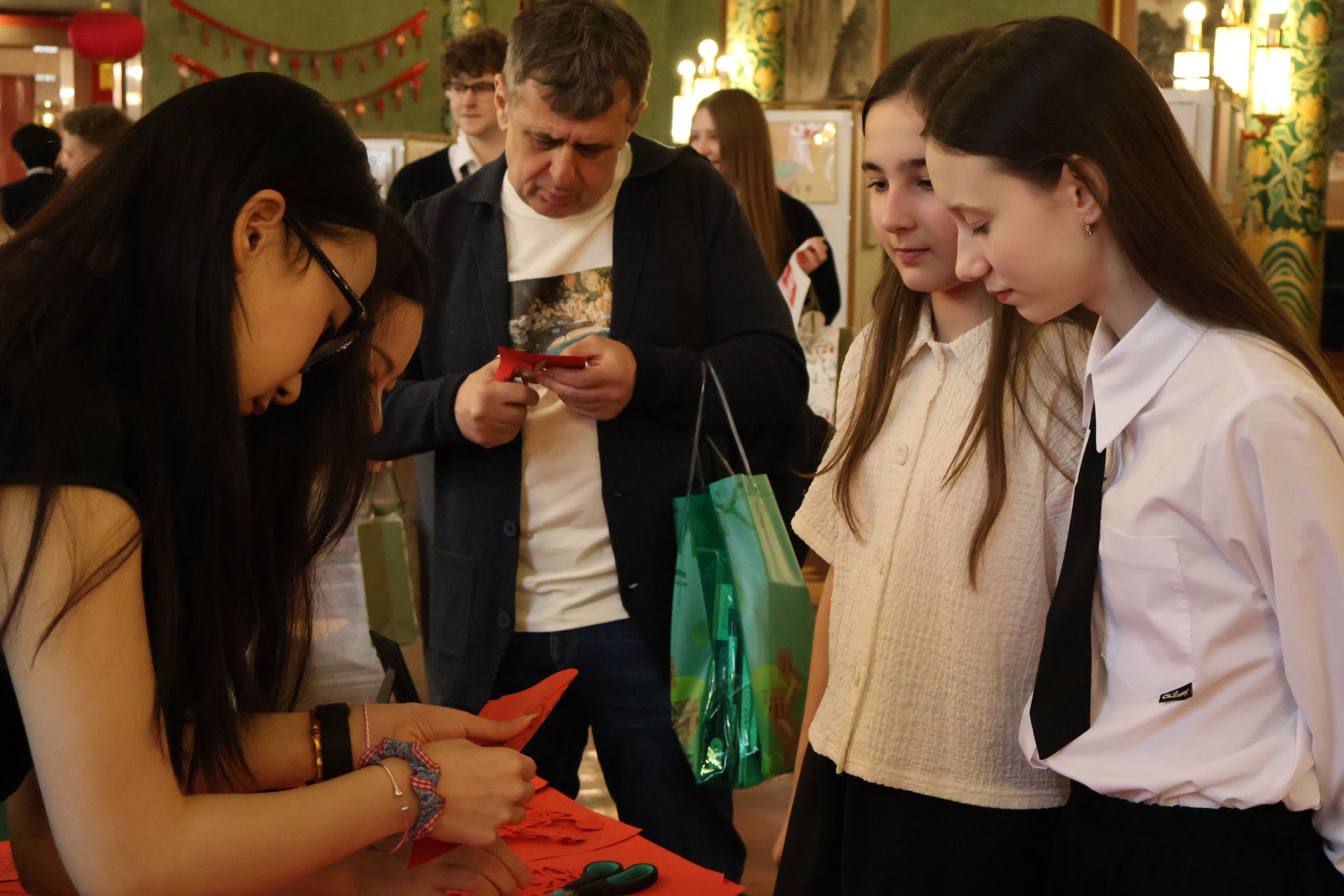 在莫语大孔院展台,参与者们在教师指导下体验传统文化技艺:书写“福”“仁义礼智信”等汉字,剪出龙、马等图案,学习编绳,拓印雕版上的老虎图案。莫斯科国立语言大学副校长伊娜拉·古谢茵诺娃参观了展台并与教师交流。
